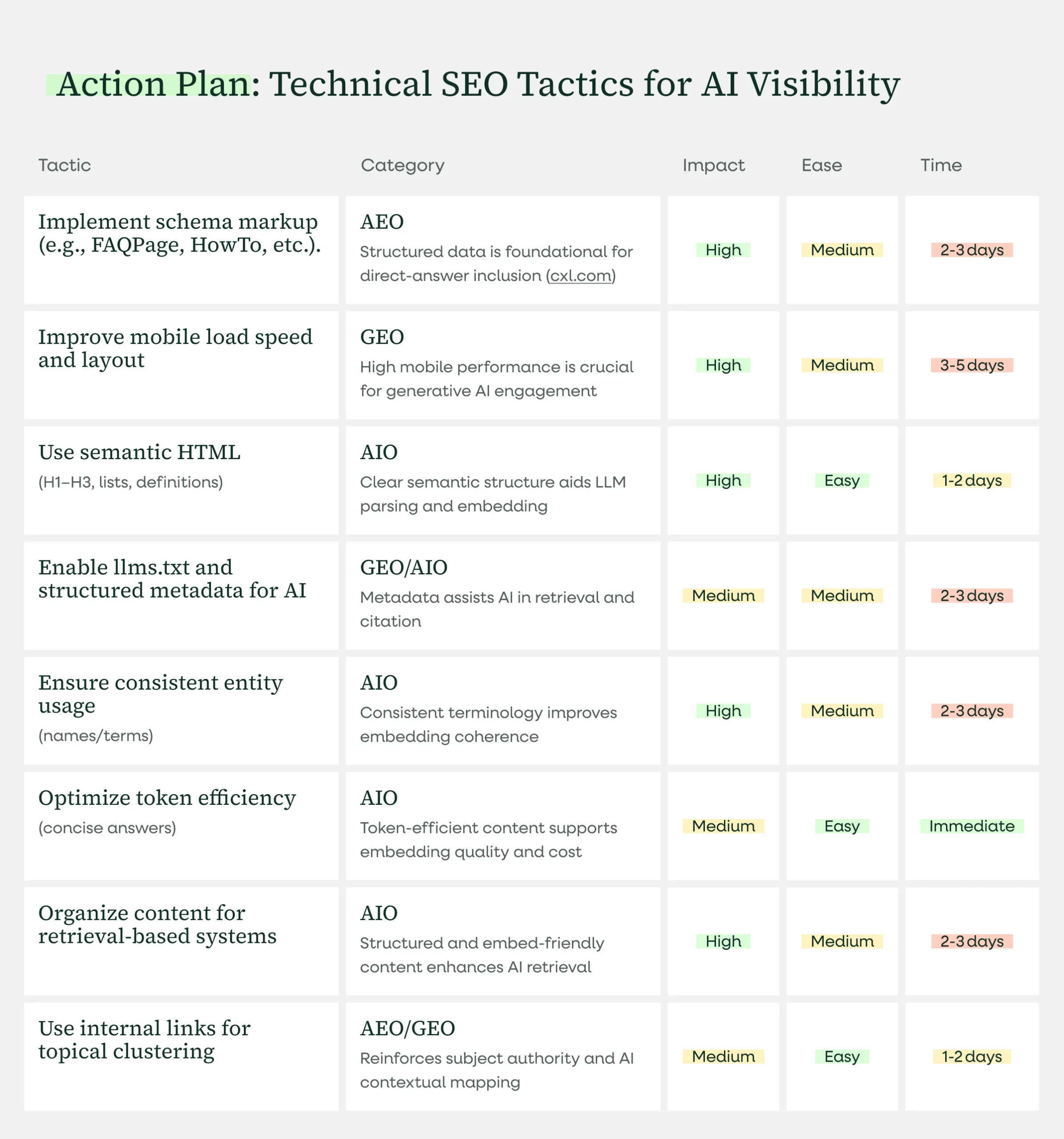 Based on our own experiments and our work with clients, these content optimizations deliver the highest impact for AI visibility. We’ve organized them by implementation difficulty and time investment, so you can prioritize quick wins while building toward more strategic changes.